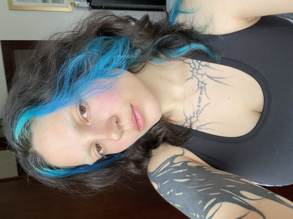 An individual with dark, wavy hair accented by prominent bright blue streaks frames their face while posing for a medium close-up indoors