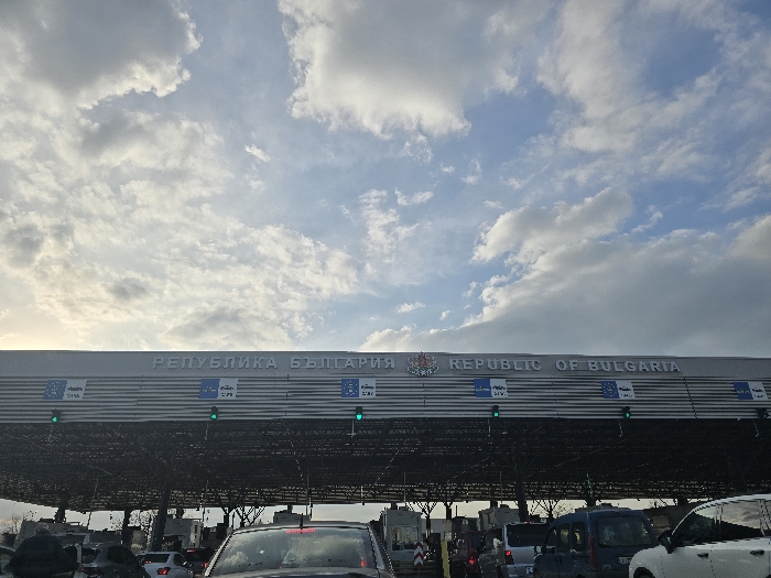 An image captured at the Kapitan Andreevo border crossing in Bulgaria depicts a multi-lane vehicle checkpoint under a partially cloudy sky