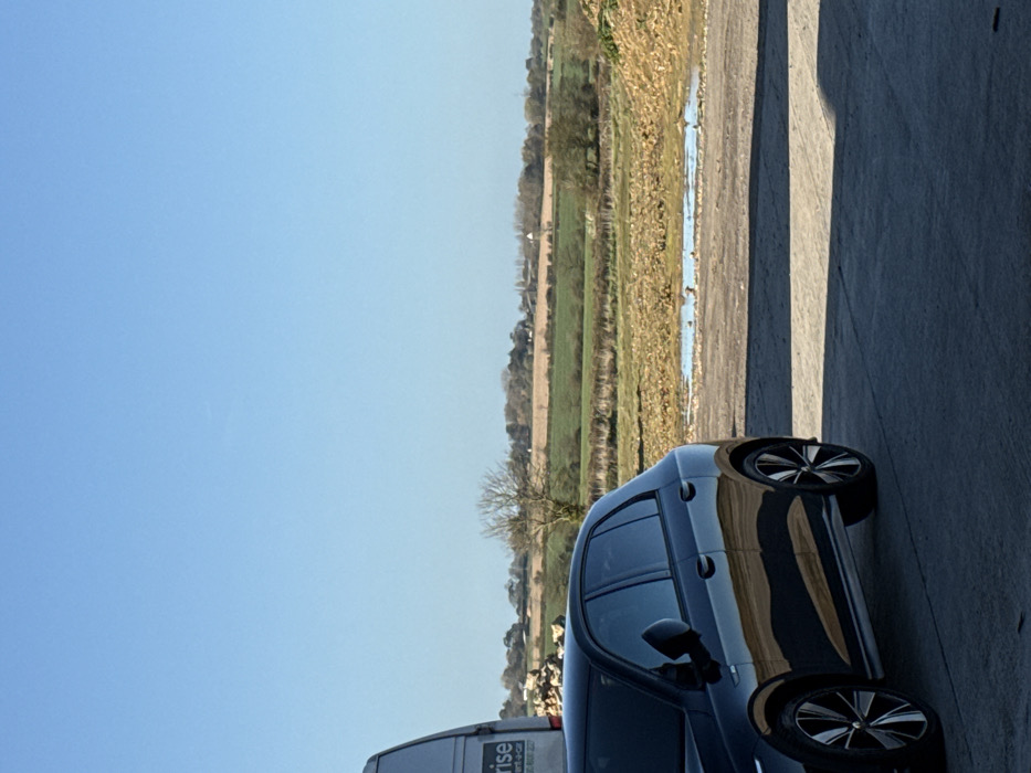 The image depicts an exterior scene under a clear, cloudless blue sky, situated in the specified area of Epping Forest, United Kingdom. In the foreground, a dark-colored hatchback automobile, likely a Volkswagen Golf, is parked on a paved concrete or asphalt surface, facing left. Its left side, including multi-spoke wheels, is visible, reflecting sunlight. Partially obscured to the left of the hatchback is the rear portion of a white commercial van, bearing the text "rise" and "rent-a-car," indicative of Enterprise Rent-A-Car. Beyond the paved area, the mid-ground features a stretch of disturbed, light-brown earth containing multiple irregular puddles of standing water that reflect the sky. This area transitions into a strip of green and brownish vegetation. The background is dominated by expansive agricultural fields, primarily light brown and green, interspersed with scattered trees, some appearing bare. On the distant horizon, multiple structures are discernible, including a prominent light-colored spire or building. No individuals are present, and all vehicles are stationary.