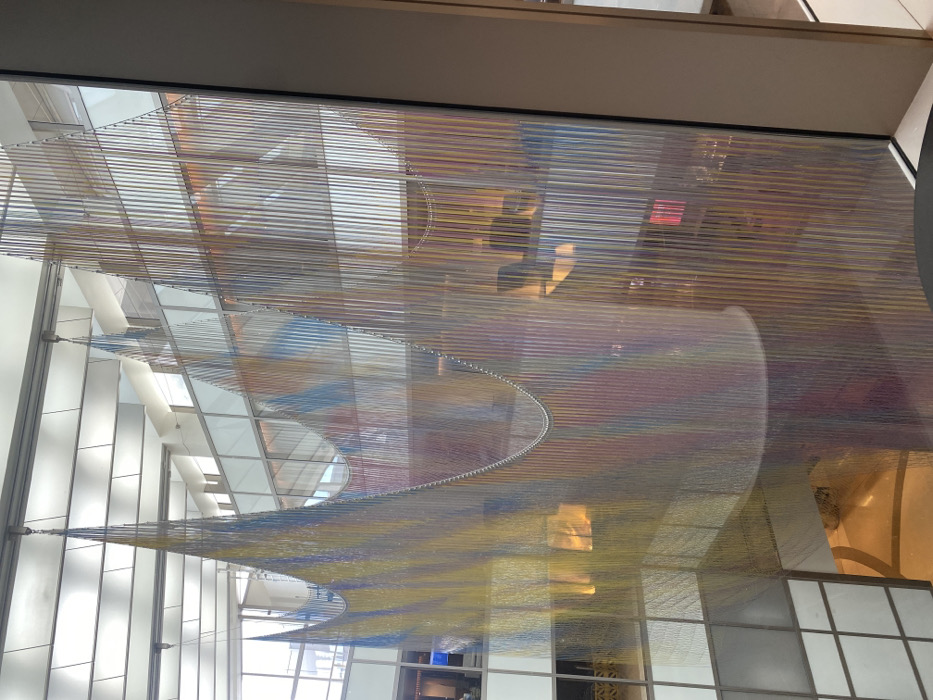 The photo depicts a contemporary art installation, seen from a high angle through a window. It features a large, airy structure composed of numerous vertical strands, subtly colored in a gradient of yellow, blue, and red. The strands are suspended to create undulating, curved shapes that resemble waves. The installation reflects the light from the adjacent windows, creating a play of shadows and highlights that enhances its visual complexity.