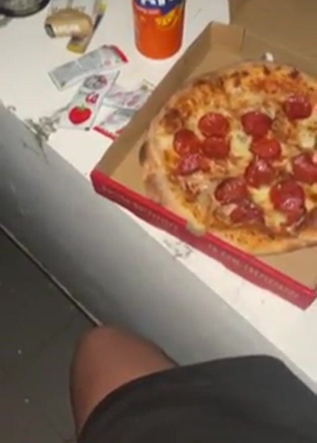 The video begins with a view of a pizza in a box, an open can of Fanta, and packets of what appears to be ketchup on a white surface