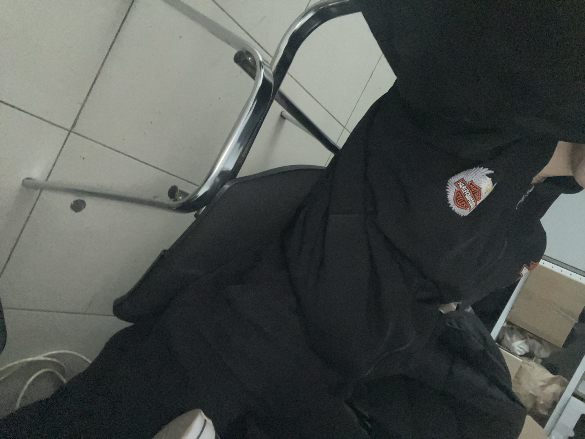 The image depicts a person sitting on a chair indoors. The person is wearing a black hooded sweatshirt with a Harley-Davidson logo on the chest. A part of a metal chair is visible, as are some white tiles on the floor. Part of a white shoelace is also visible. The location is not apparent from the image, thus I cannot determine if this is Sofia, Bulgaria.