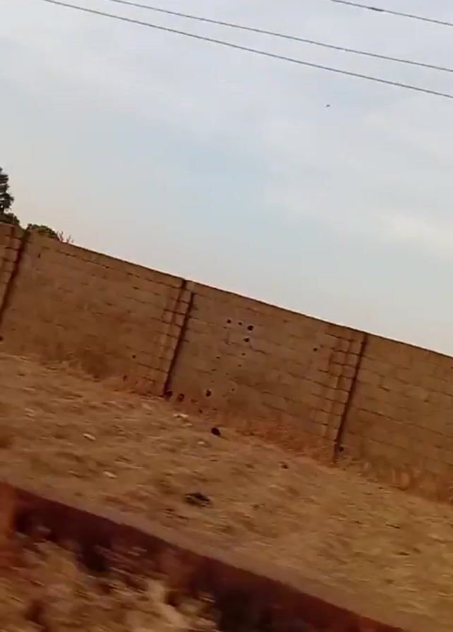 The video appears to be taken from a moving vehicle, likely a car, driving on a paved road next to a wall. The wall is made of concrete blocks and extends along the side of the road. The area between the road and the wall is mostly dry, reddish-brown soil with some sparse vegetation. Beyond the wall, trees can be seen in the distance. The sky is overcast. The perspective and speed of the video suggest that the camera is inside a moving vehicle.