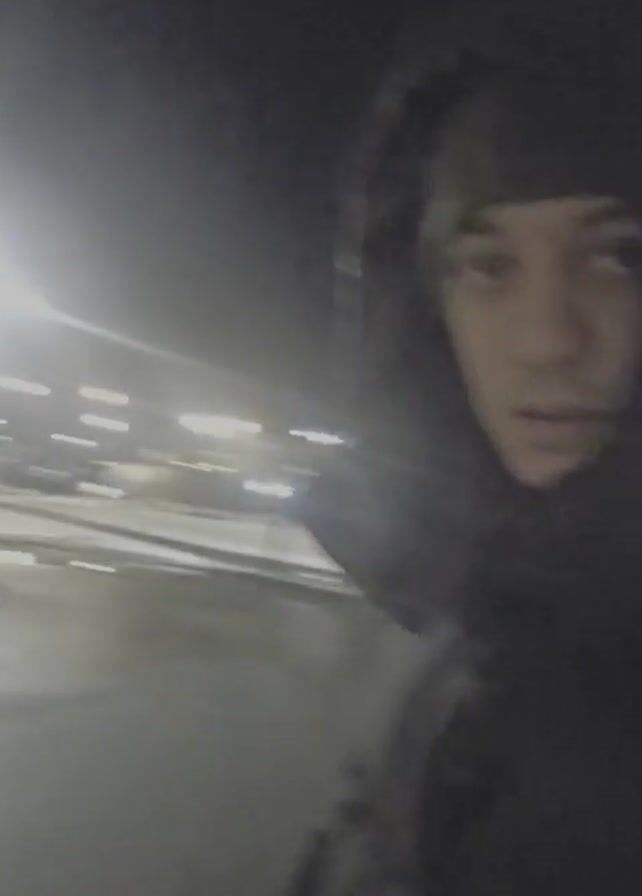 person wearing a black hooded jacket and a hat, with a visible nose ring. The person is outside at night, likely in a snowy environment. They walk under a covered area with a corrugated ceiling and square lights. Outside the covered area, there's snow on the ground and street lights are visible in the distance. The person passes by a brick wall and a glass door. The footage appears to be captured from a personal device, possibly a phone, held by the subject.