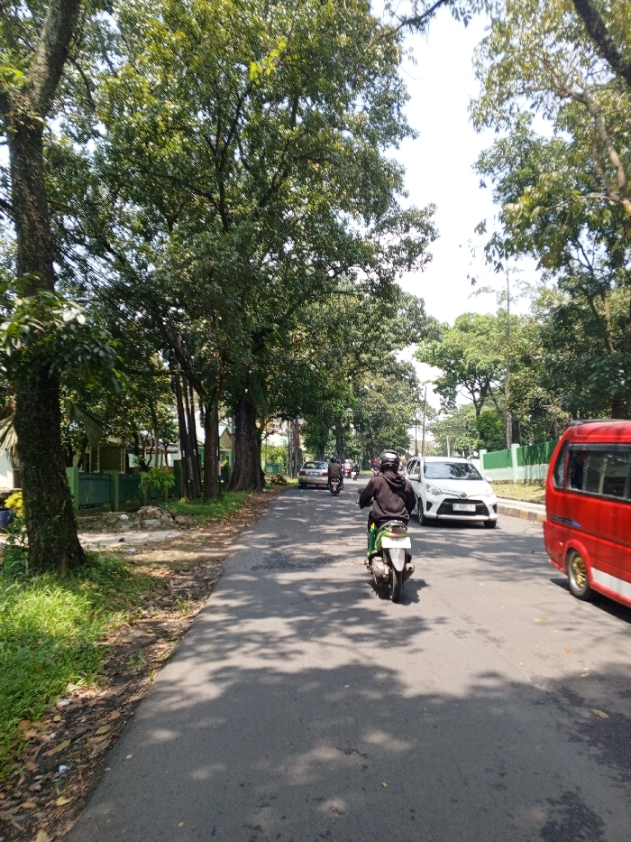 The image captures a street scene in Multhan, India, under clear daylight conditions. An asphalt road, displaying multiple potholes and dappled with tree shadows, dominates the foreground and extends into the background. A red passenger van, partially visible on the far right, features a gold-colored wheel and is oriented to move away from the camera. In the central foreground, an individual wearing a dark jacket and a helmet operates a white and green scooter, proceeding in the same direction. Ahead of the scooter, a white sedan or small SUV is positioned on the right side of the road, facing the camera. Additional vehicles, including another scooter, are visible further down the road. Both sides of the street are lined with numerous mature trees featuring dense green foliage. Behind the trees on the left, residential buildings with green fencing are observable. The sky above is bright and clear.