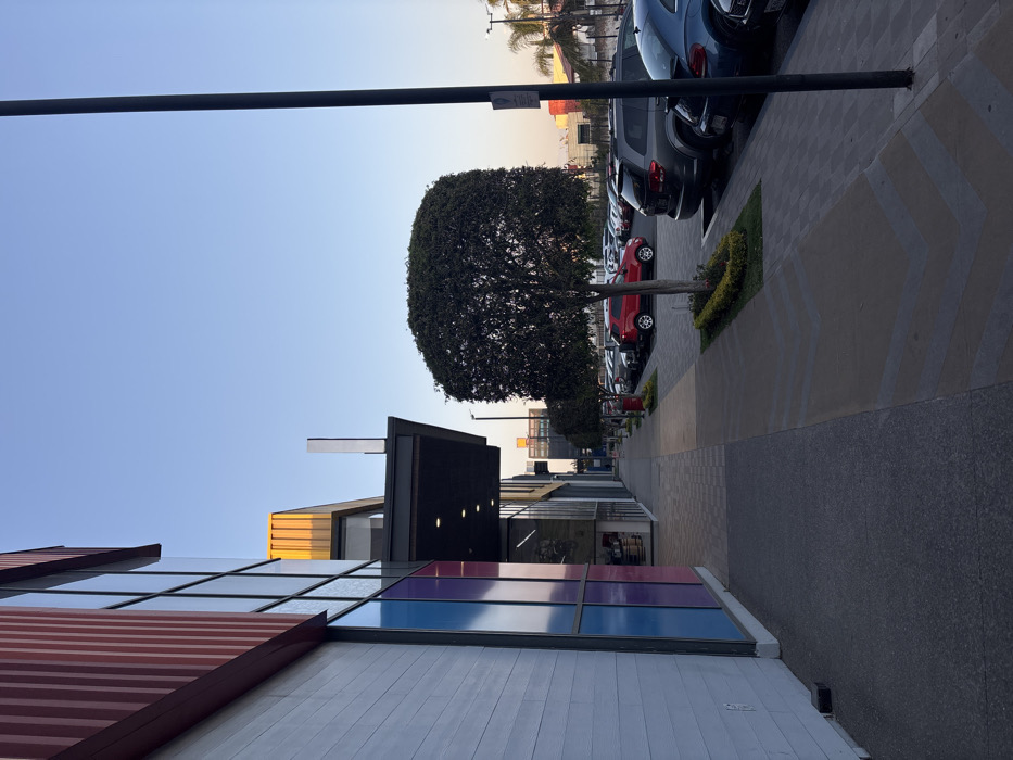 The image depicts an exterior commercial area in San Pedro Cholula, Mexico, illuminated by low-angle natural light consistent with late afternoon or early morning. On the left, a multi-story building presents a lower facade clad in light-colored horizontal paneling, with an upper section featuring large glass windows reflecting blue, purple, and red hues. Above this, reddish-brown vertical corrugated metal siding is visible, along with a distinct yellow architectural element on an upper level. A covered entrance with recessed downlights extends from the building further down the visible sidewalk. A dark grey concrete sidewalk in the immediate foreground transitions into a patterned walkway composed of light grey pavers, running parallel to the building. This walkway is bordered by several round, manicured trees, each planted in a rectangular ground bed containing low green hedges. To the right of the walkway, a paved parking lot is visible, occupied by numerous vehicles. These include a prominent red SUV, a dark grey SUV, and a dark blue sedan, among others. A tall, black utility pole stands vertically on the far right side of the frame, extending from bottom to top, with a small white sign affixed to it. Distant palm trees are discernible on the horizon to the right. The sky overhead is clear, exhibiting a gradient from light blue to a pale orange tone near the horizon. No individuals or active interactions are present within the scene.