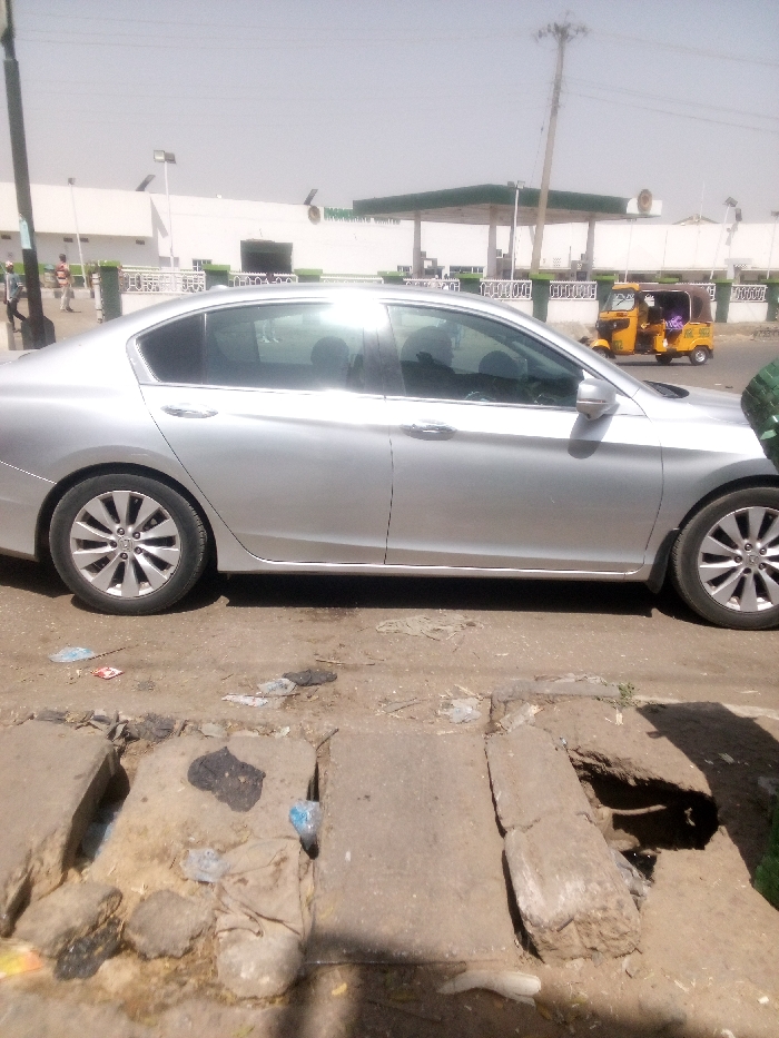 A silver sedan is parked on a street with a damaged drainage system. The road has trash and debris scattered around the drainage system. A gas station is visible in the background with a yellow auto rickshaw near it. A utility pole stands tall near the gas station. The sky is clear and bright.