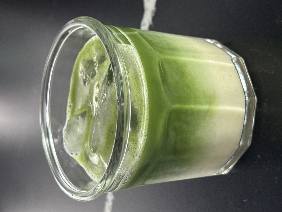 A glass of iced matcha latte sits horizontally on a dark surface with a marble-like vein