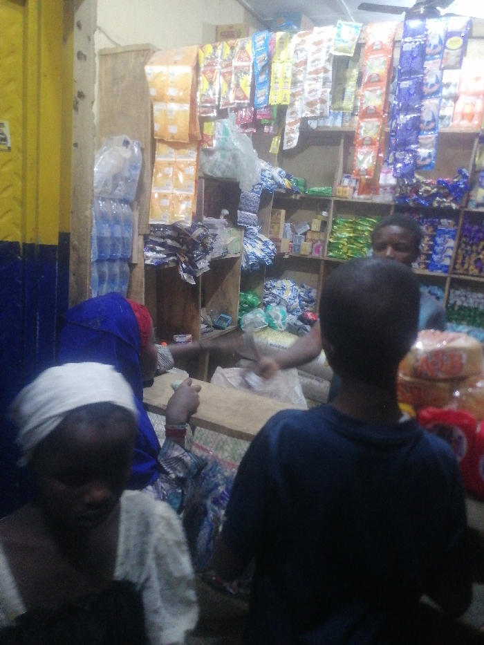 A dimly lit store displays various items like water bottles, packaged goods, and sweets on wooden shelves. A woman in a blue headscarf hands money to a storekeeper. Two children stand in the foreground; one wears a white head covering and a light-colored shirt, while the other, with their back to the camera, wears a dark blue shirt. The atmosphere suggests a local shop where everyday purchases are made.