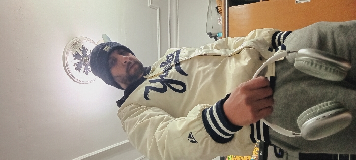 A man wearing a navy beanie, an off-white jacket with navy accents and script, and gray sweatpants holds a pair of silver headphones with white cords. He stands in a room with off-white walls, a white ceiling trim, and a decorative ceiling light. Behind him, a wooden cabinet is partially visible. His face is slightly obscured by the beanie and shadow.