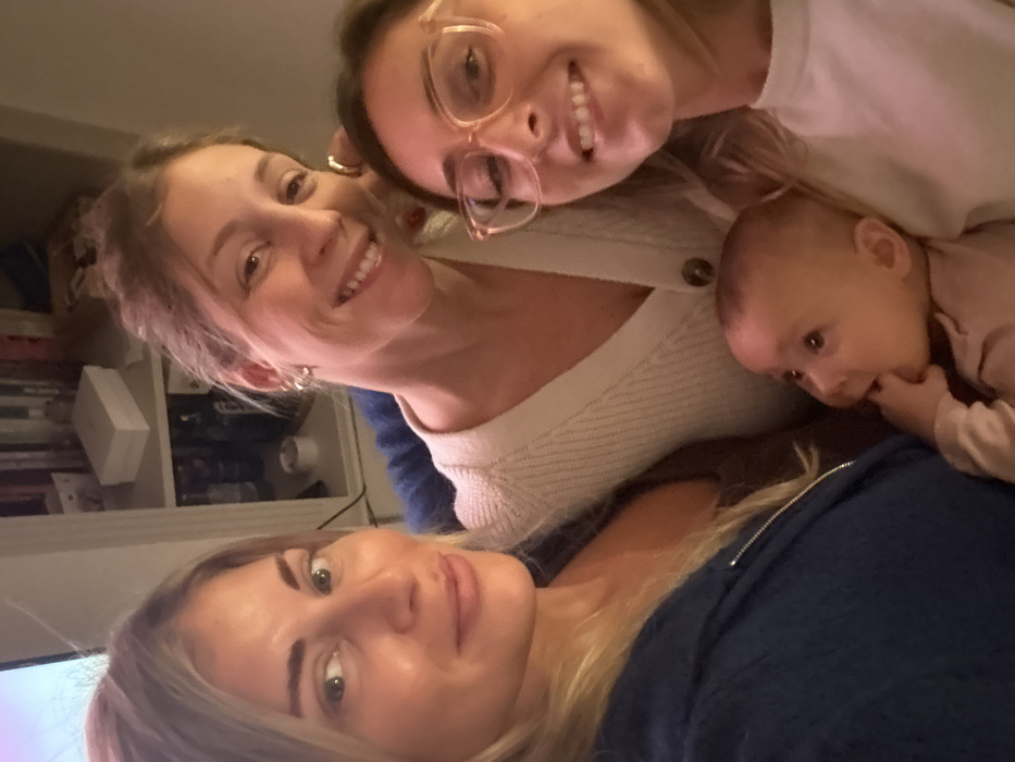 The image depicts three adult females and one infant in an indoor setting within Rueil-Malmaison, France. The perspective indicates a close-up group photograph. An adult female on the left, with blonde hair and light eyes, wears a dark blue zippered garment and looks forward with a subtle smile. A second adult female, positioned centrally, has light brown hair styled back, wears a light-colored V-neck button-up cardigan, and small hoop earrings; she smiles towards the camera. Her left arm is visible behind the first female's shoulder. A third adult female is partially visible on the right, featuring darker hair, light-rimmed glasses, and a white top; she also smiles towards the camera. An infant with light hair, dressed in a light-toned long-sleeved top, is situated in the lower center foreground of the group. Its right hand is in its mouth, and its gaze is directed upwards and to the left. The background shows a light-colored shelving unit. The upper visible shelf contains multiple white rectangular items and various smaller objects. The shelf below holds several dark-colored bottles and a white cylindrical object. The scene is illuminated by interior lighting.