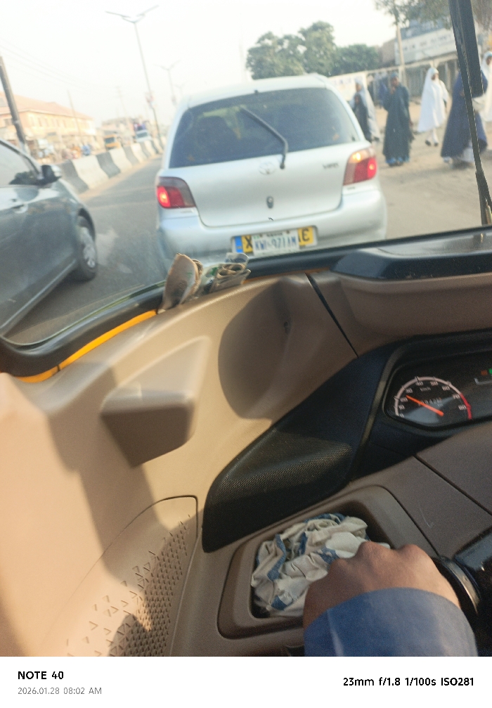 From the perspective inside a car, a silver Toyota Yaris with license plate XKW-921AM is seen in front, followed by another car on the left. Pedestrians dressed in traditional garb walk nearby. The driver's hand and dashboard are visible. The speedometer shows a speed around 40 km/h. A crumpled cloth sits in a compartment. The photo was taken with a NOTE 40 at f/1.8, 1/100s, ISO281, on January 28, 2026, at 8:02 AM.