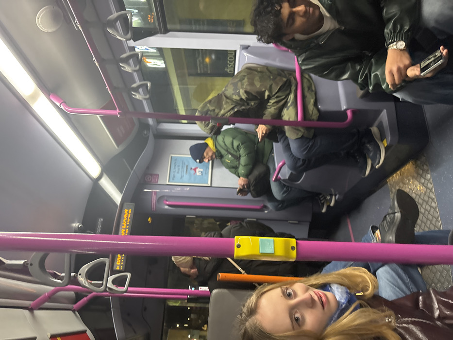 Inside a bus, several individuals are occupied. A young woman with blonde hair and a maroon jacket gazes forward. Behind her, a row of passengers are seated, including two men in green jackets and another man wearing a green leather jacket, checking his watch and using a phone. A purple bar runs across the frame, and the bus interior is lit with ceiling lights. The overall scene appears to be a candid snapshot of daily commuting.