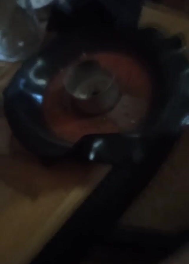 dark, blurry scene on a wooden surface. Centered is a black ashtray with an orange interior. Within the ashtray sits a small, silver, cylindrical object, possibly a candle holder or some other container. A glass jar sits to the upper left, with a small white object near it. A black, flat object, possibly a strap or a piece of material, lies at the bottom of the frame, partially obscuring the ashtray. A dark, possibly cloth, item sits in the upper left background. The lighting is poor, creating strong shadows.