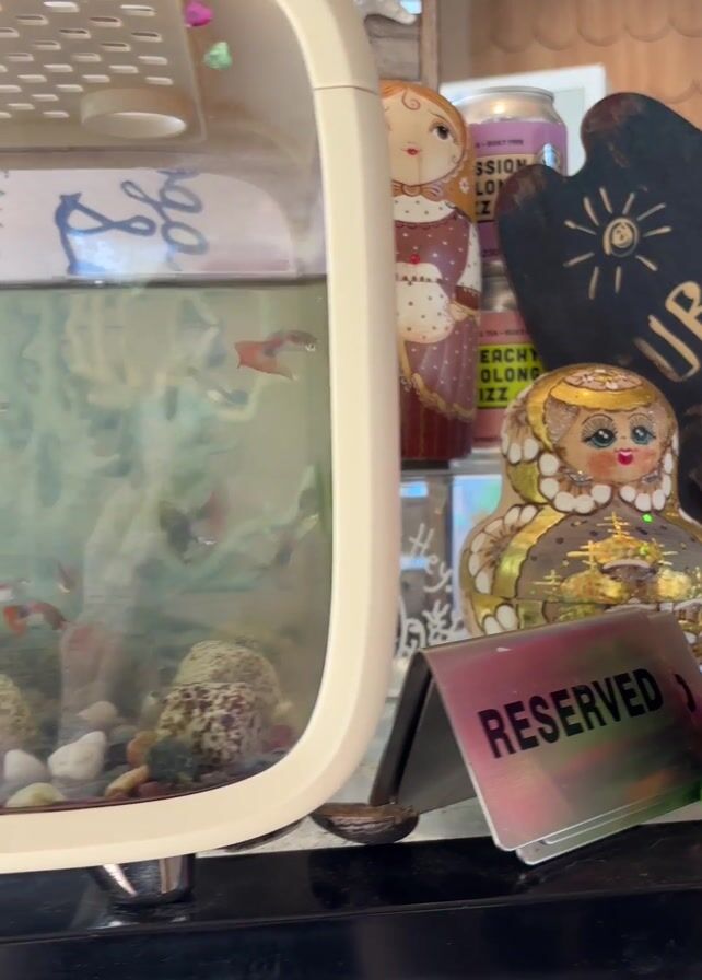 small, light beige fish tank sitting on top of a mini fridge. Inside the tank, there are several small fish, rocks, and a green plant. The tank has a clear plastic top with ventilation holes. The mini fridge is black, and there is a small sticker on the bottom that reads "The FrezzeR." In the background, there are several decorative items, including Russian nesting dolls, a can of flavored soda, a small wooden surfboard, and a bag of fish food. There is also a "Reserved" sign sitting on the counter next to the fish tank. The video appears to be taken inside of a café or restaurant.