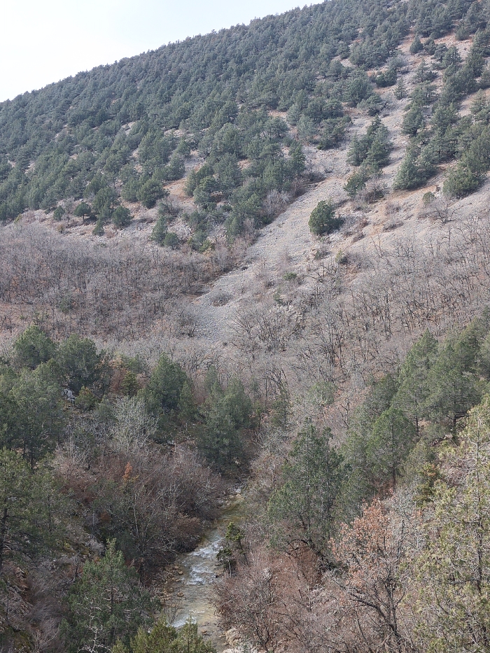 The image depicts a natural landscape within Орлиновский округ, Ukraine, presenting a deep valley or gorge. No individuals are present. The scene is dominated by a steep hillside rising from the lower left to the upper right. The upper two-thirds of this hillside are densely covered with numerous evergreen coniferous trees, primarily pines or junipers, appearing somewhat uniformly distributed on a rocky and sparsely vegetated terrain of light gray and brown. Patches of rocky scree are visible where vegetation is thinner. The lower third of the image features a winding stream flowing from the upper left foreground to the lower right. The stream contains clear, light brown water, exhibiting ripples consistent with active flow over a rocky bed. The banks of the stream and the lower slopes are heavily vegetated with a dense mix of bare deciduous trees and shrubs, indicating late winter or early spring, alongside scattered evergreen trees. Some deciduous vegetation retains dry, brown leaves. The sky above the hillside is a bright, featureless expanse.