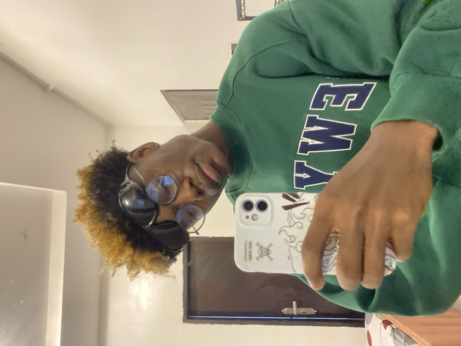 A young Black male is depicted in a mirror selfie, positioned in an interior room in Igboefon, Nigeria. He has short, curly hair, dark at the back and sides, transitioning to bleached blonde or light brown on top. He wears two pairs of glasses: one pair of clear-lensed, round-framed spectacles on his face, and a second, darker pair of sunglasses pushed up onto his forehead. He is dressed in a dark green crewneck sweatshirt with large, dark blue capital letters, possibly "YWE," embroidered on the front. His right hand holds a white smartphone with dual rear cameras, encased in a white protective cover featuring black line art, including a skull and crossbones motif. The background consists of plain white walls, a dark brown wooden door with a silver handle to the left, and a portion of a bed with patterned sheets visible in the lower left. The lighting is bright and even.