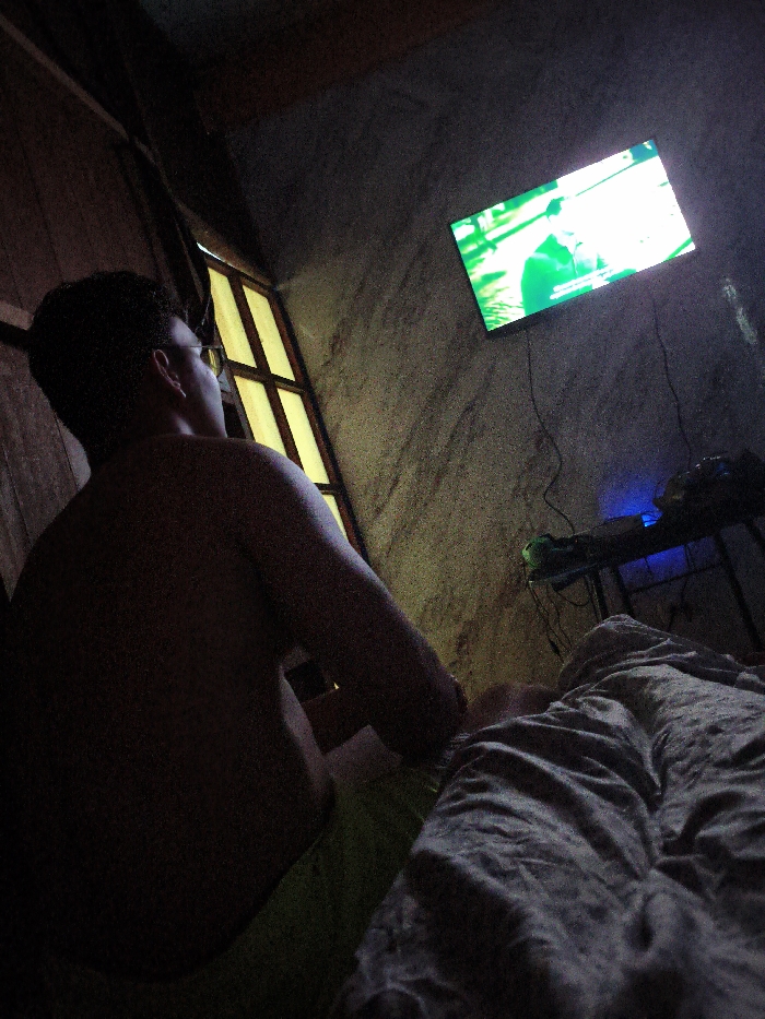 The image displays an interior room, likely residential, located within the city of Juan Griego, Venezuela; a precise address or specific location within the city is not discernible from the visual information provided. An adult male is depicted from behind and to the right, seated and facing a wall-mounted flat-screen television. He is shirtless, wears light-colored shorts, has short dark hair, and wears glasses. The television screen exhibits bright green-toned content, suggesting a video game or nature program. To the male's left, a window with a multi-paneled wooden frame allows yellow-tinted daylight to penetrate the otherwise dimly lit room. Below the television, a dark surface supports electronic devices, including one emitting a distinct blue LED light, with associated cables visible. In the foreground on the right, a rumpled, grey-toned blanket covers a portion of a bed or seating area. The room features textured, uneven walls and some wooden paneling near the window.