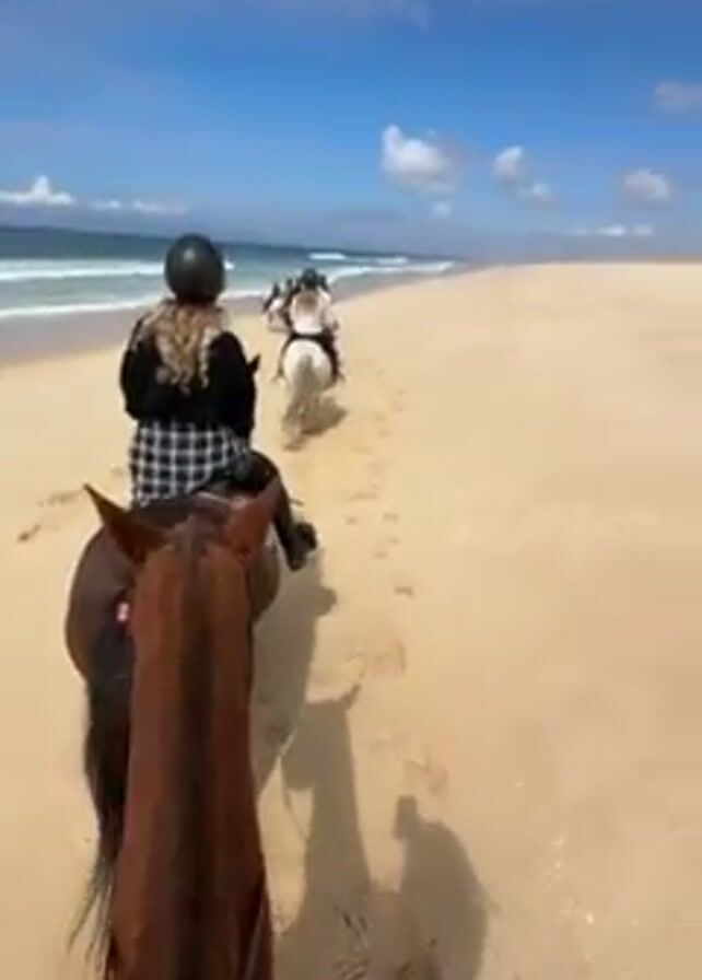 group of people horseback riding on a sandy beach. The sky is partly cloudy and the ocean is visible with small waves. The person recording the video is on a brown horse and turns the camera around to show their face, smiling. The video then pans back to the view of the beach.