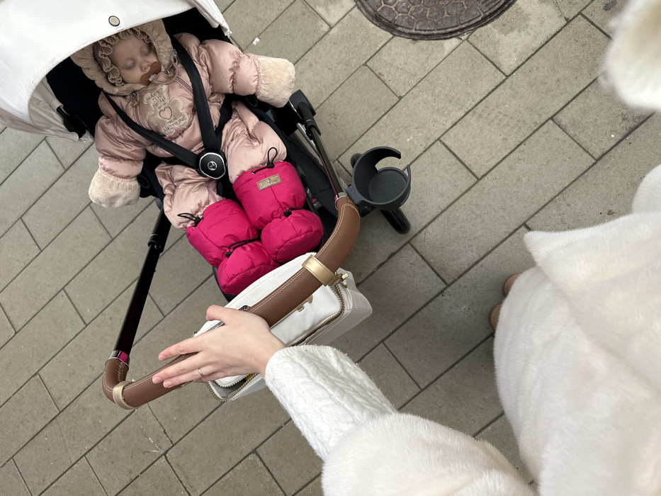 The scene, located in Khimki, Russia, shows an overhead view of a baby sleeping in a white and black stroller positioned on a light grey paved surface. The baby is dressed in a light pink, hooded, fur-trimmed snowsuit with a decorative emblem on the chest, and a brown pacifier is in its mouth. Its legs are covered by two bright magenta footmuffs. A black five-point harness with a central metallic buckle secures the child. An adult's fair-skinned hand, wearing a ring on the left ring finger, is visible near the stroller's brown leather handlebar, which supports a white handbag with brown leather accents. The adult's arm and lower torso are covered by a cream-colored, fuzzy garment with a visible knitted pattern on the sleeve. The ground consists of rectangular grey concrete blocks laid in a stretcher bond pattern. A textured, circular metal manhole cover is partially visible on the lower right of the frame. A black cup holder is attached to the stroller frame on the right side.