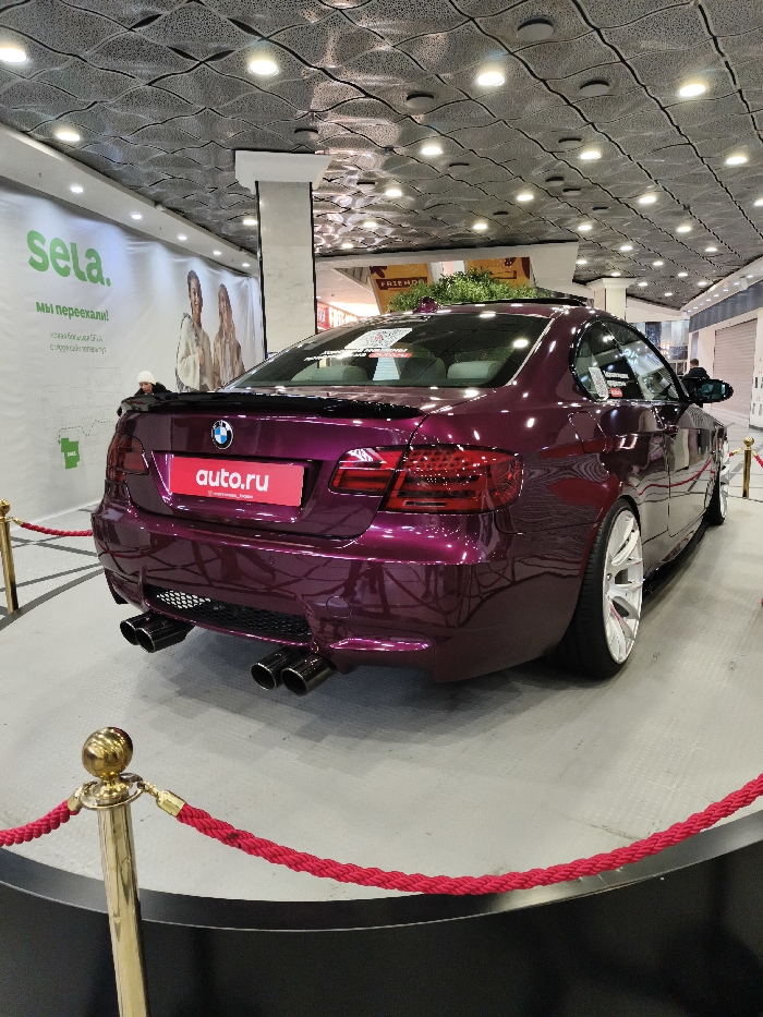 A purple BMW with a spoiler and four exhaust pipes is on display, roped off by red velvet ropes and gold stanchions. The car has an "auto.ru" license plate and a sunroof. The background includes a shopping center with bright overhead lighting and a "Sela" advertisement.
