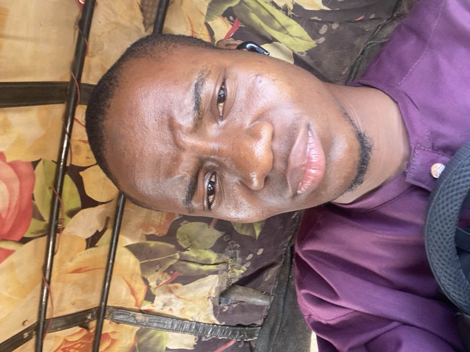 A young adult male is depicted in a head-and-shoulders selfie, looking directly at the camera with a neutral to slightly serious expression. He has dark skin, short dark hair, and a short goatee. He wears a solid dark purple long-sleeved garment with a banded collar. A black wireless earbud is visible in his right ear. The background shows the interior of what appears to be a commercial vehicle, such as a tricycle (Keke Napep), characterized by a patterned fabric ceiling featuring large red, yellow, and green floral designs on a dark brown or black base. Two horizontal metal bars and a portion of the vehicle's structural frame are visible across the background. A section of a black mesh object, possibly a bag or strap, is visible at the bottom left. The scene is situated within the city of Baganakwo, Nigeria.