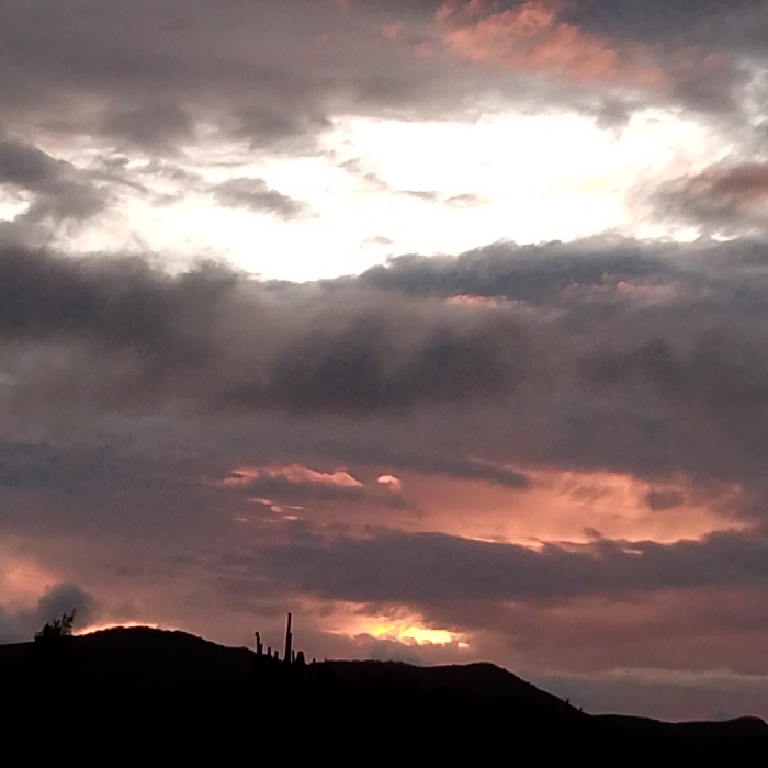 A dramatic sky dominates the image, filled with layers of dark, moody clouds tinged with pink and orange hues. A bright opening pierces through the upper cloud layers, creating a striking contrast. Below, a dark silhouette of a hill and sparse vegetation, including cacti, adds a sense of depth and place to the scene. The overall impression is one of a powerful and beautiful sunset or sunrise.