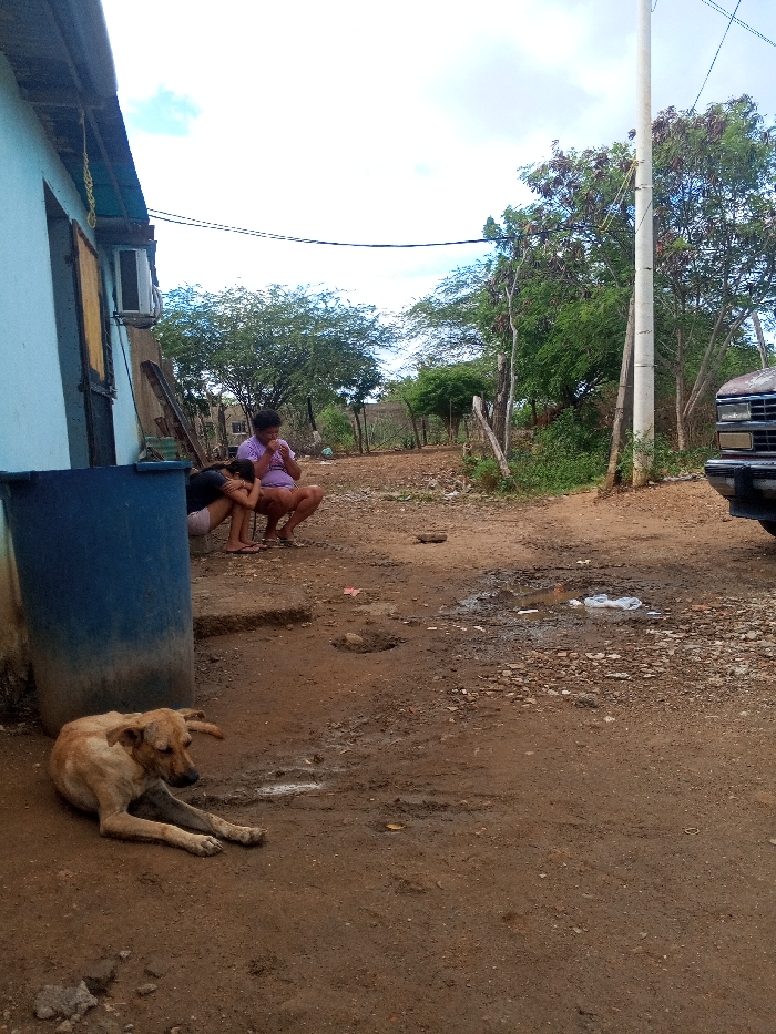 Two people sit on a low concrete step in front of a blue building, while a dog lies on the ground. A blue bin stands beside the step. The ground is muddy. A puddle reflects the sky. A car sits on the right side of the image. Trees are in the background, and power lines stretch across the sky.