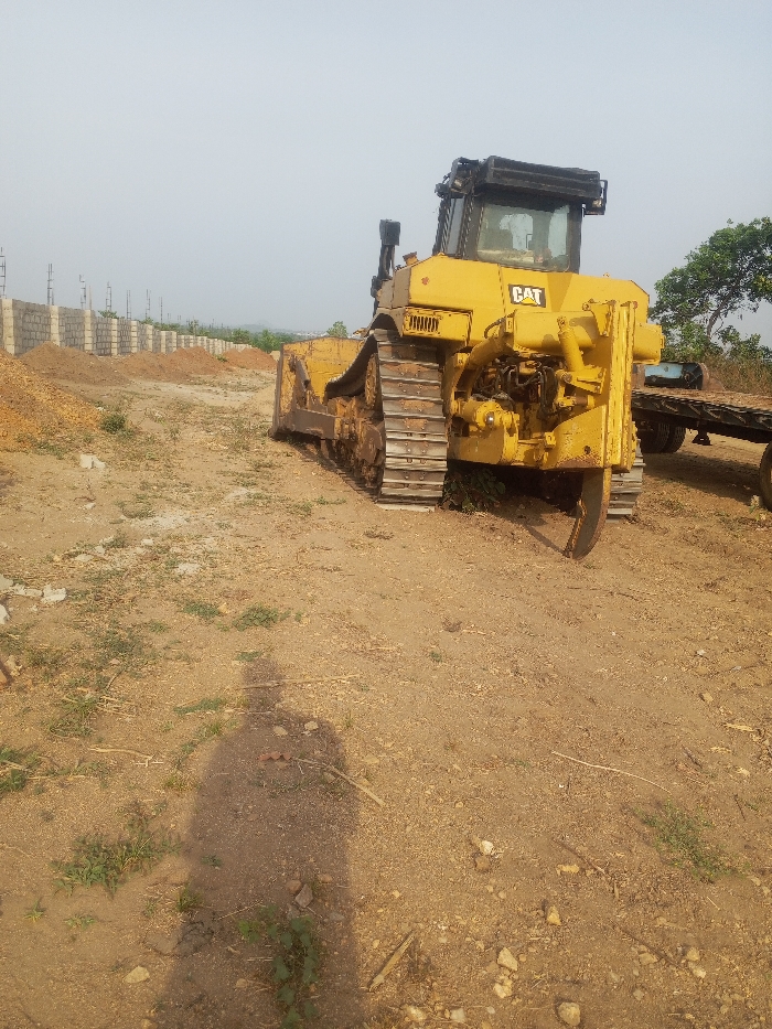 The image displays an active construction or land development site in Zango-ndaji, Nigeria, under bright daylight conditions. A large, yellow Caterpillar (CAT) brand track-type tractor (bulldozer) is the primary subject, positioned right of center and angled slightly left toward the viewer. The bulldozer features a visible operator cabin, engine housing, and a track system on both sides. A single-shank ripper assembly is attached to the rear of the vehicle, with its tooth making contact with the ground. To the right of the bulldozer, a flatbed trailer, partially obscured, is visible. In the mid-ground on the left, a linear structure of partially constructed walls, composed of light-colored concrete blocks with vertical rebar extensions, stretches horizontally. Piles of reddish-brown soil are present near these walls. The ground surface consists of dry, uneven, reddish-brown earth with sparse green vegetation, scattered small rocks, and dried plant debris. A human shadow is cast on the ground in the lower-left foreground. The sky above is clear and light blue, transitioning to a pale, hazy white toward the horizon, where distant hills or terrain features are visible.