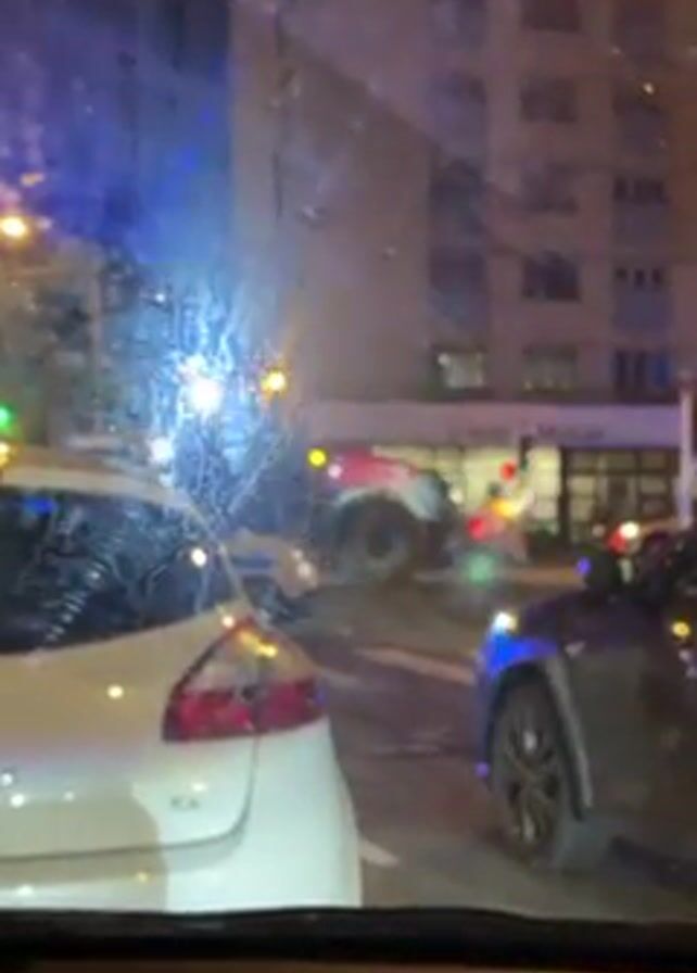 street scene at night, filmed from inside a car. The windshield is dirty. Visible are a white car in front of the camera car, a dark car to its right, and multiple police cars with flashing blue lights at an intersection. A red vehicle that appears to be a fire truck or emergency vehicle is partially visible behind the police cars, near a building labeled "Credit Mutuel". The street is lit by streetlights and vehicle headlights. The traffic light is green.