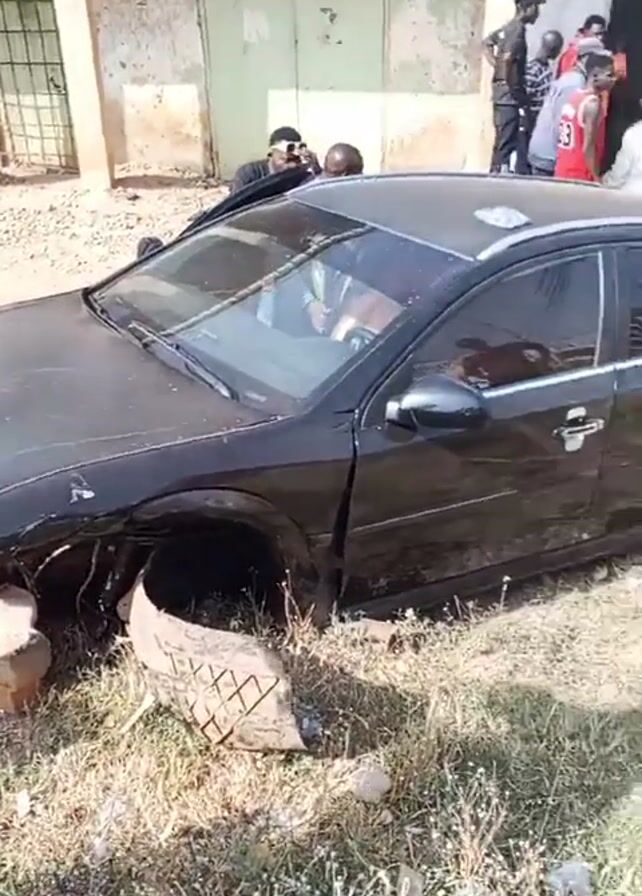black Opel Vectra car that has been damaged in an accident. The front bumper is missing, and the front left wheel is gone, with a tire carcass lying nearby. The car is off the road, on a grassy area next to a building. People are standing around the car, observing the scene. Some appear to be taking pictures with their phones. The building in the background has a simple, painted facade, and there is evidence of trash and debris on the ground, suggesting the area is not meticulously maintained.