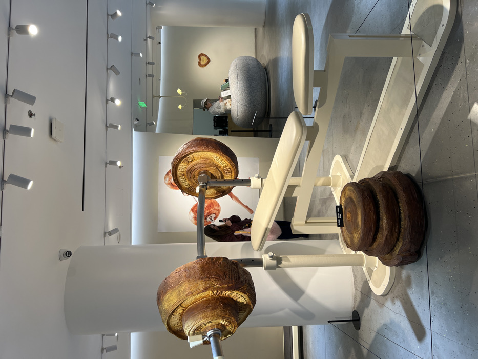 The scene is set inside Gallery All, located at 128 Hengshan Road, Xuhui District, Shanghai, China. The central focus is a large-scale art installation resembling a barbell with a weight bench. The barbell's weight plates are sculpted as oversized, textured, dark brown snail shells, one of which clearly displays "MADE IN NEW YORK" embossed on its surface. The barbell bar and support structure are metallic grey, while the accompanying weight bench is off-white and features a minimalist design. On the floor at the base of the barbell rack, three smaller, similarly sculpted snail shell-like weights are stacked, with a small black sign reading "PLEASE DO NOT TOUCH" nearby. A transparent barrier runs along the floor in front of the installation. In the mid-background, a woman with long dark hair, dressed in a reddish-brown top and dark pants, stands behind the barbell, holding a smartphone and appearing to photograph the installation. Behind her, a large white canvas displays artwork featuring a reddish-toned human figure holding a barbell with snail shell weights. To the right, a reception area is visible, where an individual wearing a white hat and shirt stands behind a low, grey, textured cylindrical counter, engaged with an item on its surface. A minimalist chandelier hangs above this counter, and a heart-shaped decorative object is affixed to the light-colored wall beyond. The gallery space features white walls, white pillars, polished grey flooring, and an array of ceiling-mounted track lighting and security cameras, providing bright, even illumination.