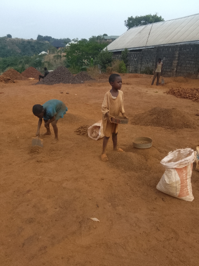 Four children labor in a dusty, outdoor environment. Two are in the foreground: one is sifting soil with a tool, the other is digging. Another child works further away with a shovel. In the background, another child sits on a pile of dark material. Bags of material and piles of dark matter are scattered around. Buildings and greenery are in the distance.