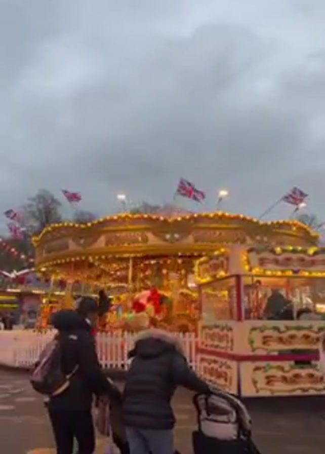 carnival with a carousel in the foreground and other rides further back. The carousel is brightly lit and decorated with British flags. People are walking around the carnival, including two women pushing strollers. A man in a hat walks in front of the camera. The sky is overcast.