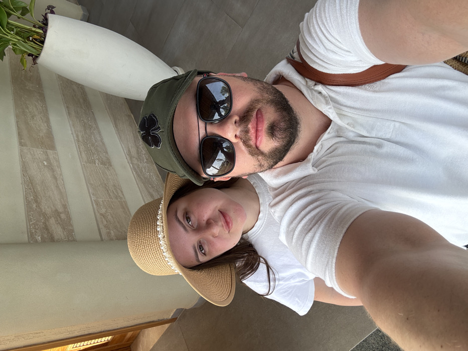 A man and a woman pose for a selfie. The man wears a green cap with a clover design, sunglasses, and a white shirt. He has a beard. The woman wears a straw hat adorned with pearls and a white t-shirt. They are outdoors, possibly near a building with light-colored tile or stone walls. A white vase with green plants is also visible.