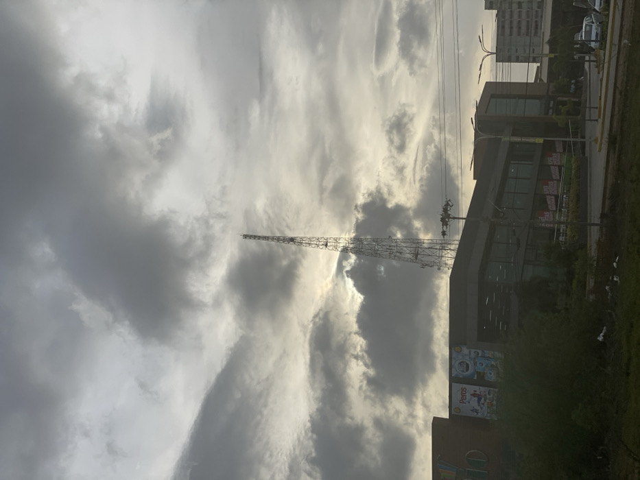 A tall radio tower stands against a sky filled with swirling gray and white clouds. The sun peeks through the clouds, casting a bright glow. To the right, a modern building with glass windows and outdoor advertising is visible. A green, grassy area runs along the building's edge, and other structures are partially seen in the background. The scene is a mix of urban development and natural sky phenomena.