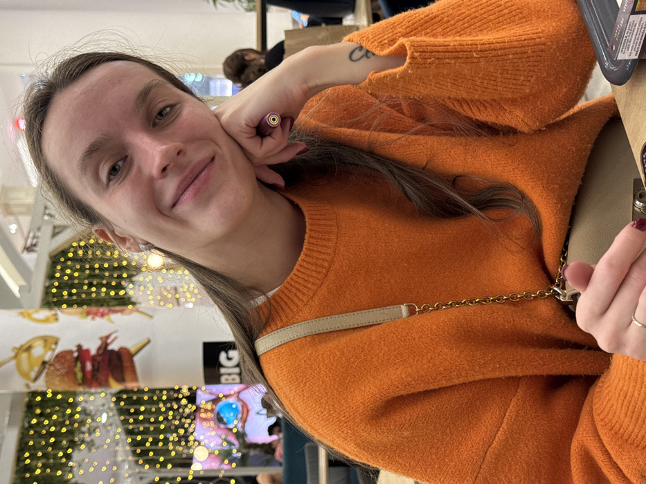 A woman with light skin, gray eyes, and long brown hair, wearing an orange sweater, smiles at the camera. She has a tattoo on her left wrist. A thin gold chain strap crosses her sweater. In the background, string lights illuminate a mural featuring food illustrations and the word "BIG" is visible.