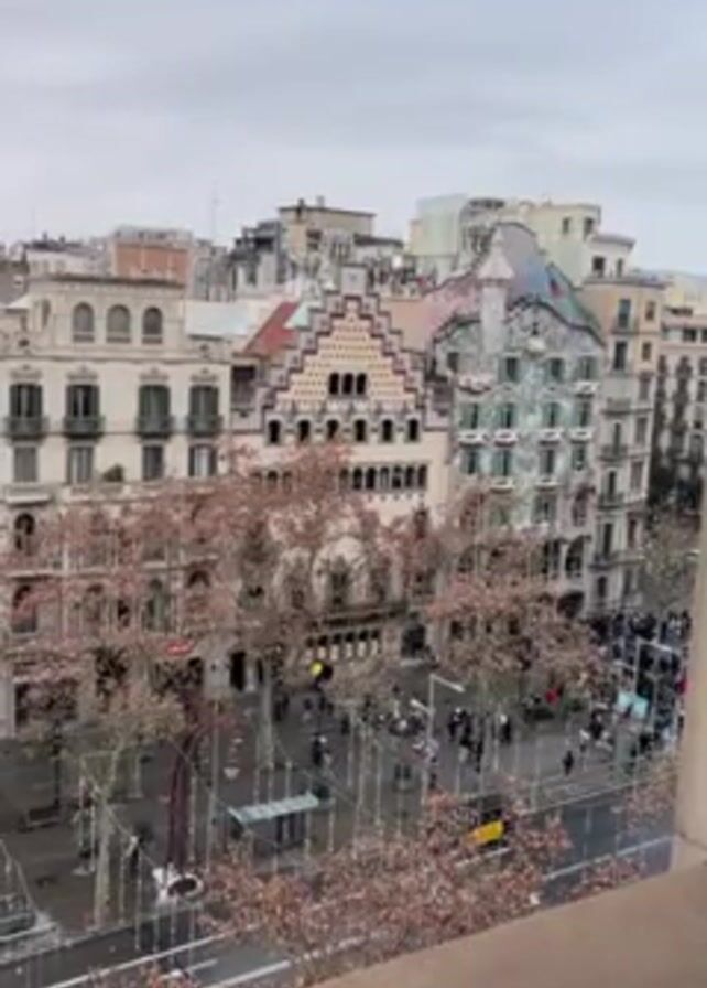 n elevated view of a city street lined with buildings. The buildings are diverse in architectural style, with one notable building featuring colorful tiles and a distinctive, undulating roof. Bare trees line the street, adorned with string lights. Pedestrians can be seen walking along the sidewalks and crossing the street. The sky is overcast. The camera zooms in slightly on the colorful building.