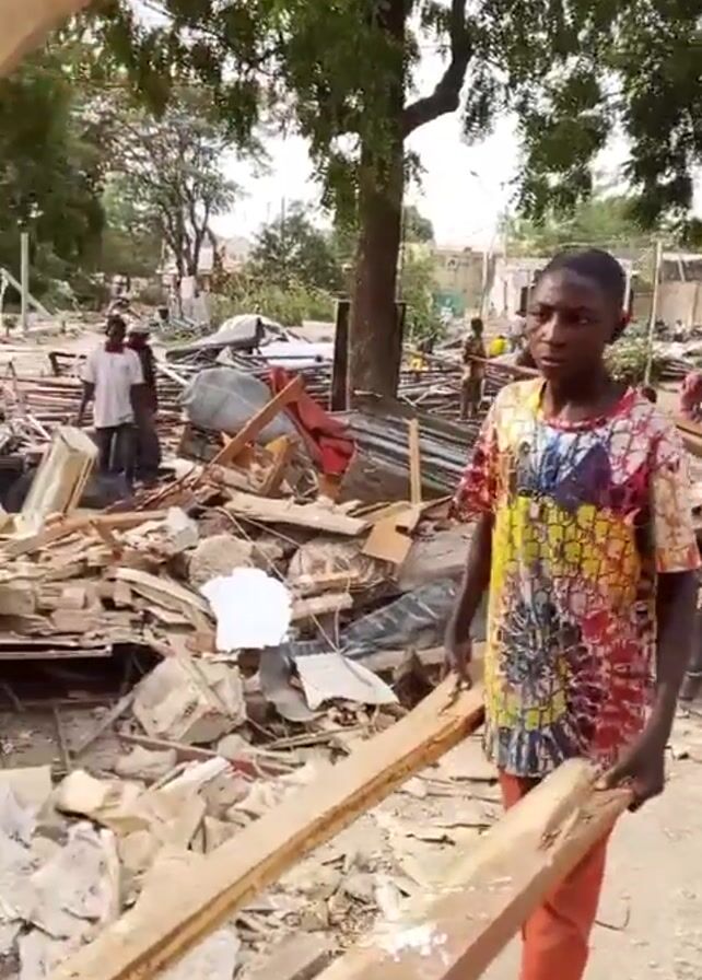 young person carrying two wooden beams through a debris-filled area. The person is wearing a colorful patterned shirt and orange pants, and sandals. The surrounding area appears to be a demolition site with scattered debris, including wood, metal, and concrete. Several other individuals can be seen in the background, some of whom appear to be sorting through or carrying materials. There are trees providing shade over the scene.