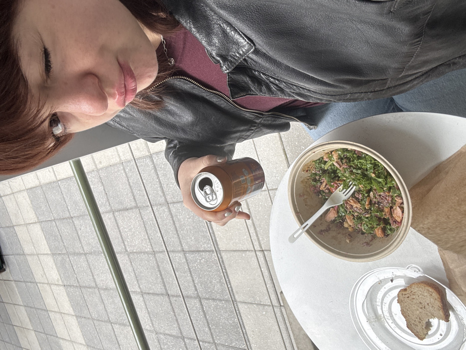 A person wearing a leather jacket holds an open can next to a white table. A salad with a fork rests on the table, along with bread in a clear container, and a brown paper bag. The person's face, red hair, and silver necklace are partially visible. A sidewalk with gray tiles is in the background.