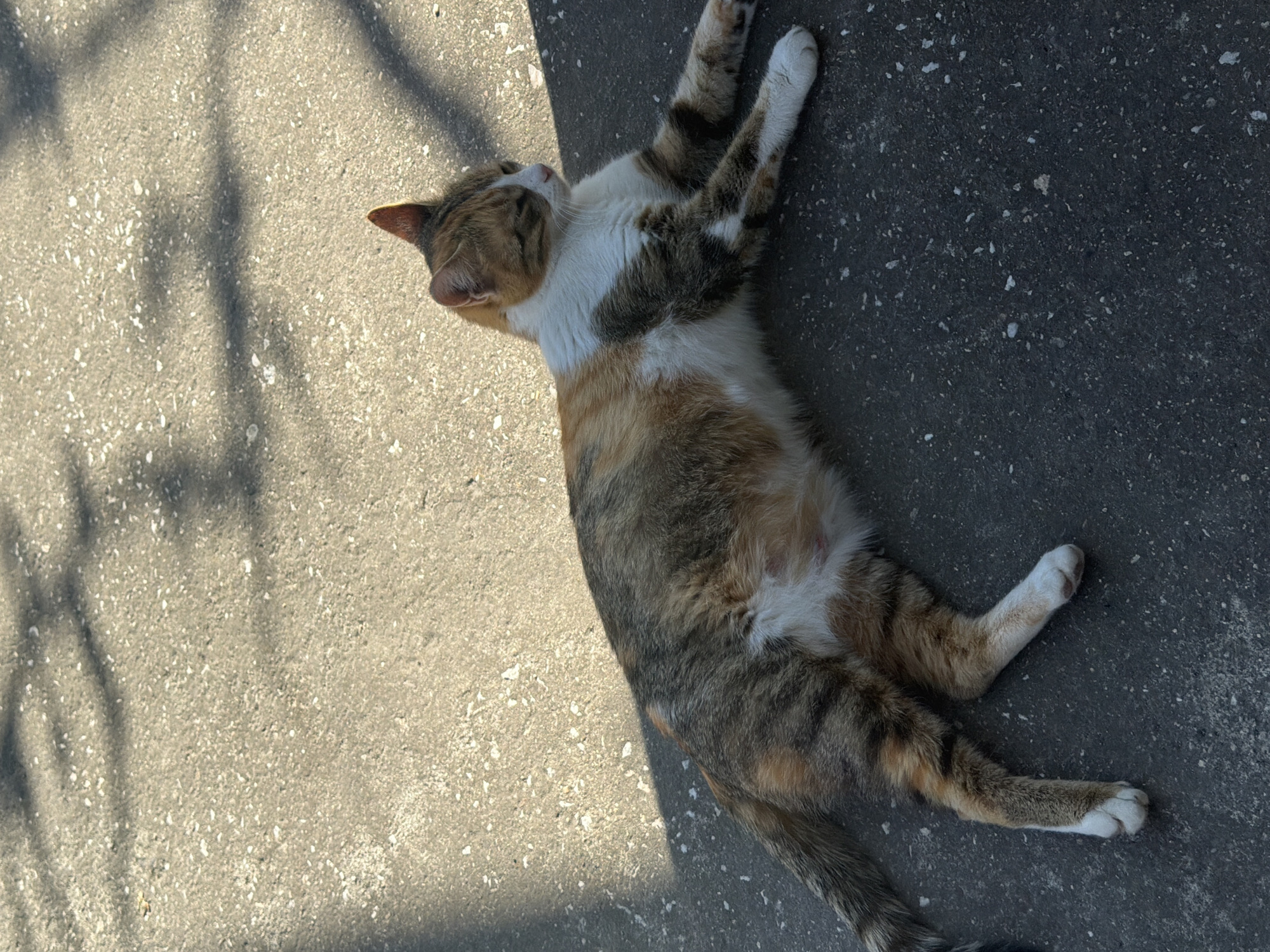 - "A calico cat lies on its back on a concrete surface" by FM-MGE4s1, licensed under CC BY 4.0