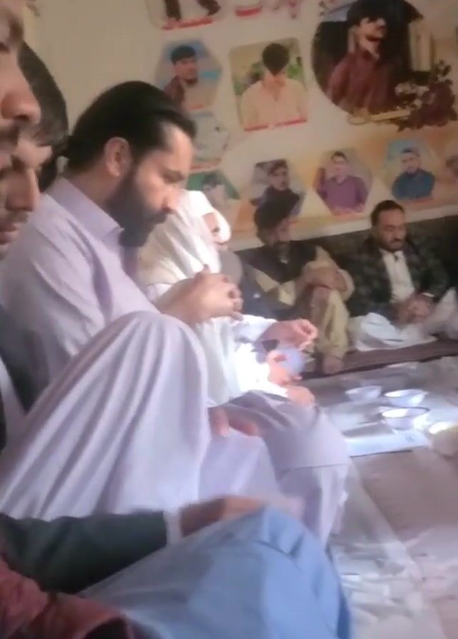A group of men and a young boy are seated on the floor around a white sheet in a room. They are arranged in a circle and appear to be eating from small bowls. Most are dressed in traditional attire, including long, loose-fitting shirts and pants, while one man is wearing a black jacket. An elderly man with a white beard and a white cap is among the group. Behind them, a wall is decorated with a banner featuring several portraits of a young man. The room is lit by natural light coming from a window in the background, and the camera is held at a low angle, showing the scene from the perspective of someone sitting within the circle.