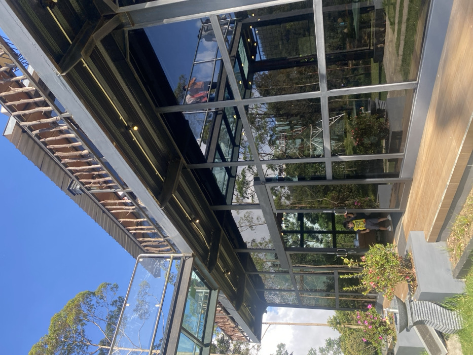 modern building with a large glass facade located in Kecamatan Tawangmangu, Indonesia, at the coordinates -7.661 latitude, 111.184 longitude. The building has a second-story balcony made of metal and wood. There is a glass-bottomed walkway visible through the windows. A young boy in a yellow t-shirt stands in front of the building’s glass doors. There are large green bushes and a stone water fountain in the foreground. The building is situated in a green, forested area. The sky is clear blue.