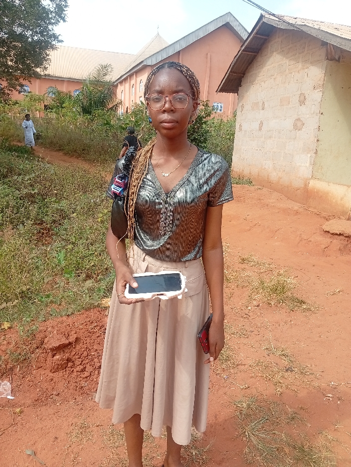 A young adult female stands centrally on reddish-brown earth, facing the camera with a neutral expression. She has braided hair, wears clear-framed glasses, a metallic silver short-sleeved V-neck top, and a light brown pleated knee-length skirt. A thin gold-colored necklace is visible, along with a black shoulder bag with colorful accents on her left side. She holds a black smartphone in a white case horizontally in her right hand, and a smaller reddish-brown device in her left hand. In the background to the left, a dirt path curves towards a large building with light orange walls and a corrugated metal roof, featuring arched windows; this structure resembles a church or institutional building. Two individuals walk along this path: one in a white garment further left, and another with a dark top and bag behind the main subject. To the right of the subject, a smaller, single-story building with light-colored concrete block walls and a simple corrugated metal roof is present. The ground is characterized by reddish soil with sparse green grass and vegetation. The setting is outdoors under a light blue sky, indicative of a semi-urban or institutional area within the city of Nsukka, Nigeria.