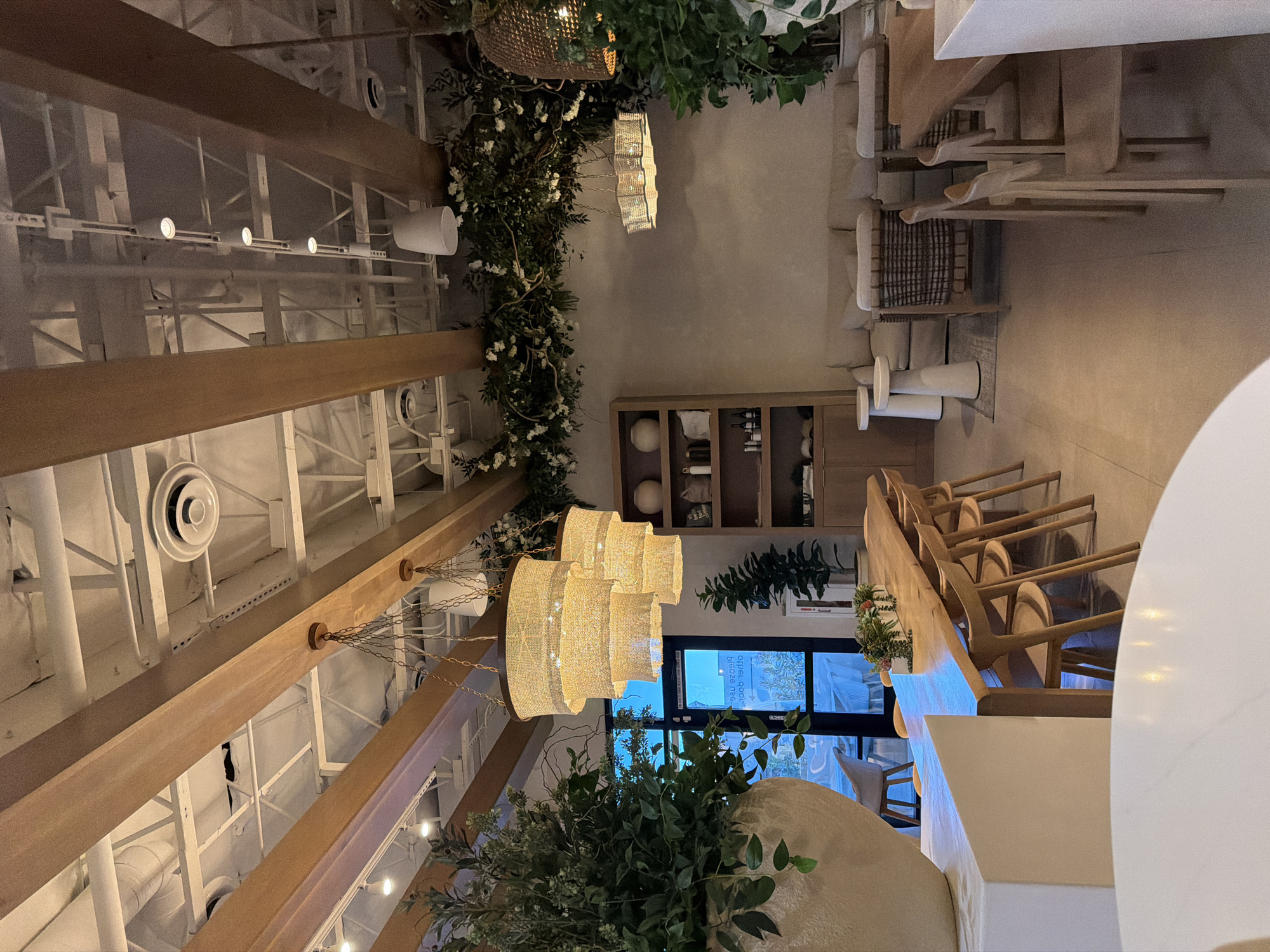 This image depicts the interior of a commercial establishment, likely a restaurant or lounge, located in the Las Vegas metropolitan area, United States. The scene features a modern, rustic-chic design with a high, exposed ceiling painted white, revealing ventilation ducts, circular air vents, and track lighting. Rectangular wooden beams traverse the ceiling, from which hang various light fixtures, including a cluster of three tiered, drum-shaped pendant lights with woven material shades in the midground, and a single wave-patterned pendant light further back. Lush green foliage, some with white blossoms, is draped along the upper walls and ceiling on the right side. In the foreground on the left, a large, light-colored planter filled with abundant green plants sits on a white rectangular counter. Partially visible in the bottom foreground is a round white table surface. To the right of this, a long, light-wood communal dining table is set with multiple matching wooden chairs arranged along both sides. Small potted plants containing green foliage and small flowers are placed as centerpieces on the table. Towards the background on the left, an open wooden shelving unit displays various decorative items such as vases, bottles, and folded linens. On the right side of the image, beyond the communal table, a lounge area features two light-colored sofas and two armchairs with woven cane backs, accompanied by two white pedestal side tables. A glass door with a dark frame is visible in the midground, reflecting the outdoor environment and displaying inverted text, "PLEASE USE OTHER DOOR." A tall potted plant stands near this door, along with a red fire extinguisher on the floor. No individuals are present in the scene. The overall lighting is warm, emanating from the various fixtures and a soft blue hue from the external light visible through the glass door. The floor is covered with light-colored tiles.