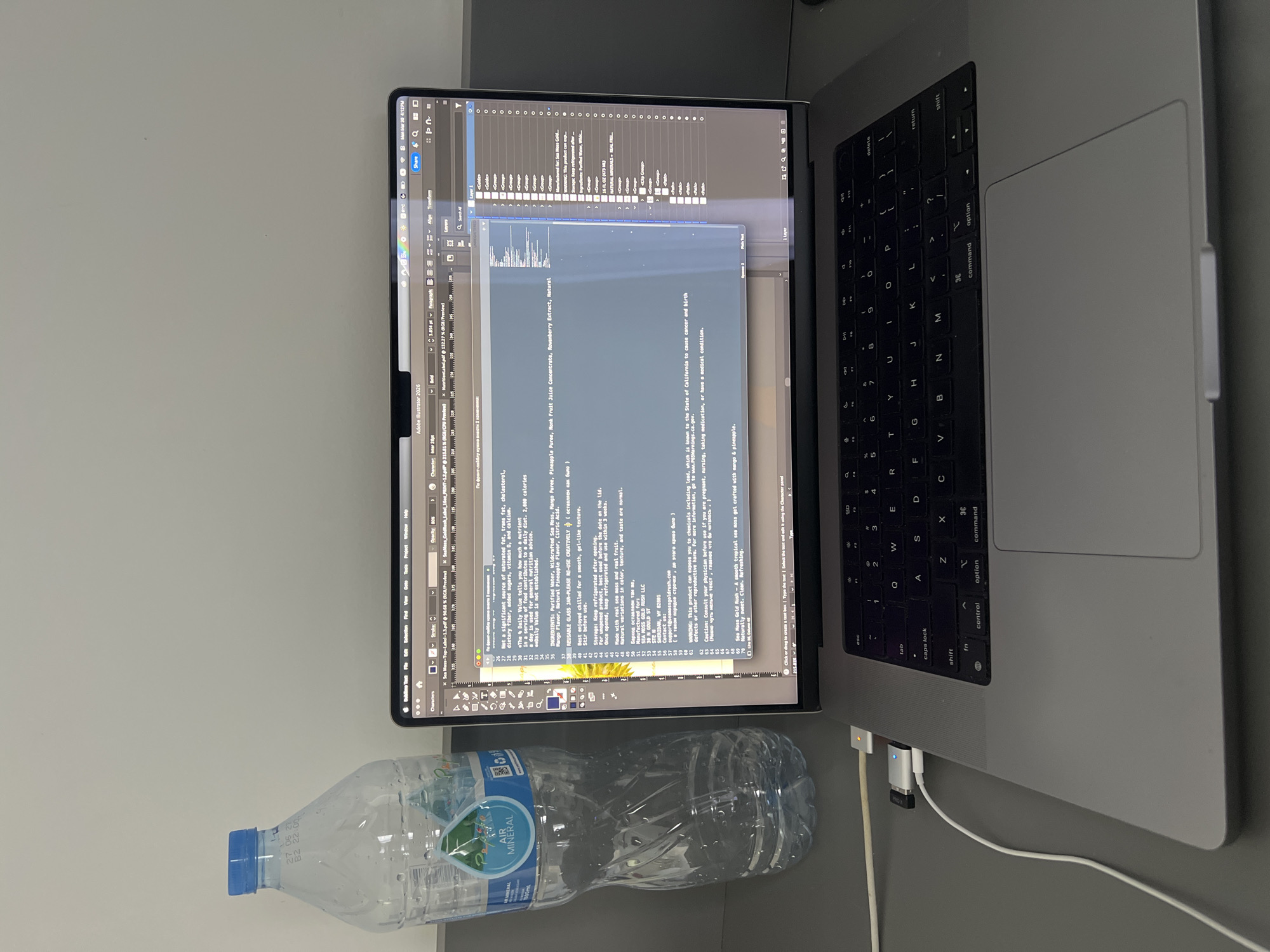 The image depicts a gray laptop, likely a MacBook Pro, open on a gray surface. The screen displays Adobe Illustrator 2026 with a document containing text, seemingly related to a food or beverage label, including ingredient information and warnings. A clear plastic bottle of "Air Mineral" water sits to the left of the laptop. Cables and a USB hub are connected to the right side of the laptop. The image provides no evidence to determine if this image was taken in the city of Kutuh, Indonesia.