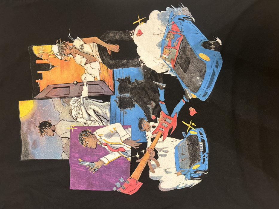 The image displays a multi-panel, stylized comic-book illustration printed on a black background, likely fabric. The artwork features a male figure with dreadlocks consistently depicted across several vignettes, suggesting a singular individual in different scenes or moods. In the upper left, the figure stands in profile, looking left, against a dynamic sky featuring both stormy clouds and a yellow sun. Directly below this, he is shown in a white shirt and red tie, holding a smartphone up as if taking a selfie, set against a purple backdrop. To the right of these scenes, a grayscale depiction shows two figures embracing. Adjacent to this embrace, an open dark wooden door reveals an orange-hued sunset sky with distant city silhouettes. In the upper right, the primary figure sits relaxed, smoking a cigarette, wearing a white t-shirt with the number "999" and black pants, while a blonde woman smokes above him. The lower half of the composition presents a more dynamic scene: the male figure, wearing a white top and blue pants, actively plays a red electric guitar mid-air, surrounded by shadowy figures, white clouds, red heart symbols, and yellow starbursts. At the bottom, two blue sports cars are visible; one is stationary on the left, and another, carrying two occupants, moves rapidly on the right, emitting white smoke or dust clouds from its rear. The illustration uses a vibrant color palette with clear outlines. The image does not depict any identifiable location in the city of Tel Aviv, Israel; it is an artistic, thematic collage of a character's experiences.