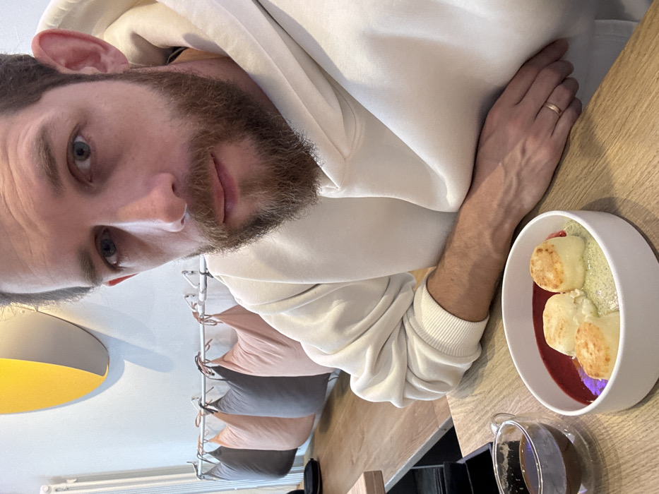 An adult male is seated at a light wood-grained counter within Kofeynya Prosto Café, located at Oktyabr'skaya Ulitsa, 1A, Zelenogradsk, Russia. The subject, with a beard and mustache, is wearing a light-colored hooded sweatshirt and a plain gold band on the ring finger of his left hand. He is looking directly at the camera. In the foreground, a white circular bowl on the counter contains three round, lightly browned food items partially submerged in a red-pink sauce and a light green sauce. To the left of the bowl, a clear double-walled glass mug holds a dark beverage. The subject's left forearm and hand rest on the counter next to the food. The background features a light-colored wall adorned with a yellow and gray semicircular decorative element and a white radiator. Below this, a row of six muted-colored padded bags (alternating gray and light pink) hangs from a white rail with hooks.