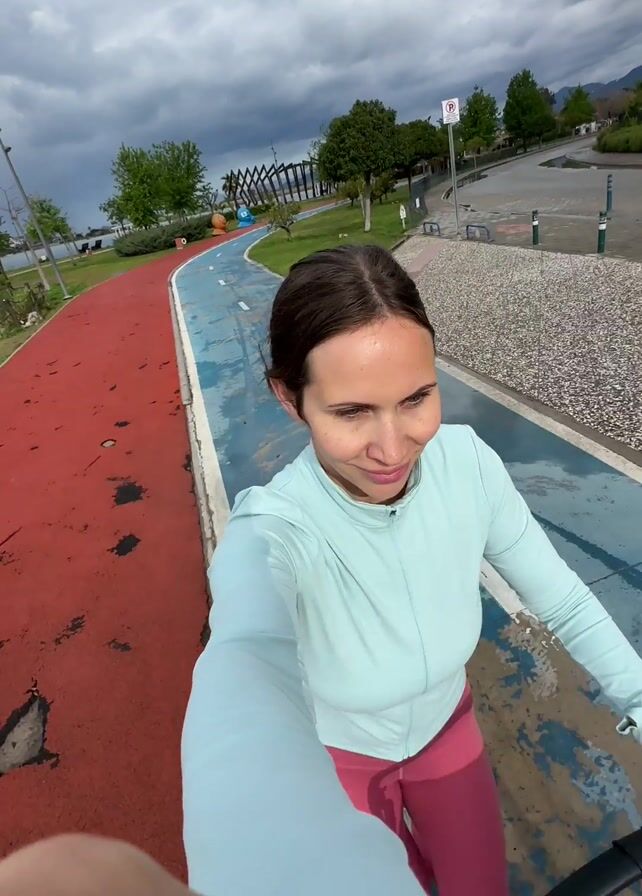 A woman stands on a red and blue track in an outdoor park, facing the camera and smiling. She is wearing a light blue athletic jacket and pink leggings, and holding the handle of what appears to be a stroller. The sky is overcast and the track curves into the distance. To the left of the track is grass and to the right is a pathway and parking area.