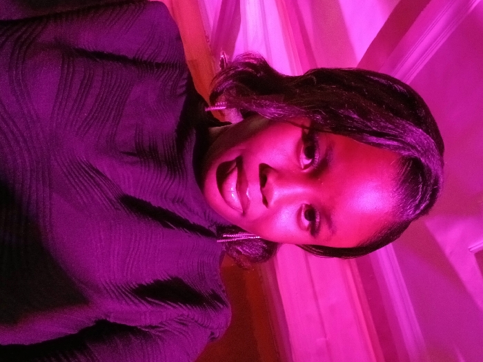 A single female subject with dark skin and dark hair, styled with a side part and soft waves, is depicted from the upper torso. She faces the camera directly with a subtle smile, her lips slightly parted to reveal the tip of her tongue. She wears long, dangling earrings and a dark, high-necked, long-sleeved top with a distinctive horizontal wavy texture. The entire scene is bathed in pervasive pink/magenta lighting, which tints her skin, clothing, and the background. The environment is an indoor setting with indistinct architectural features, possibly molding or panels, visible on a wall or ceiling. The location is undetermined; it is an indoor space within the city of Unknown, Unknown.